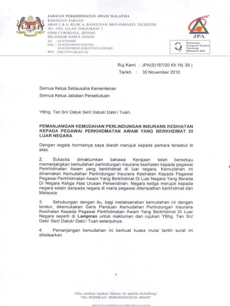 Lampiran a borang permohonan ke luar negara dan kemudahan perlindungan insurans kesihatan di luar negara atas urusan persendirian peliling. Dengan arahan surat pekeliling am bilangan 3 tahun 2012. 2 Kemudahan perlindungan insurans kesihatan kepada pegawai perkhidmatan.